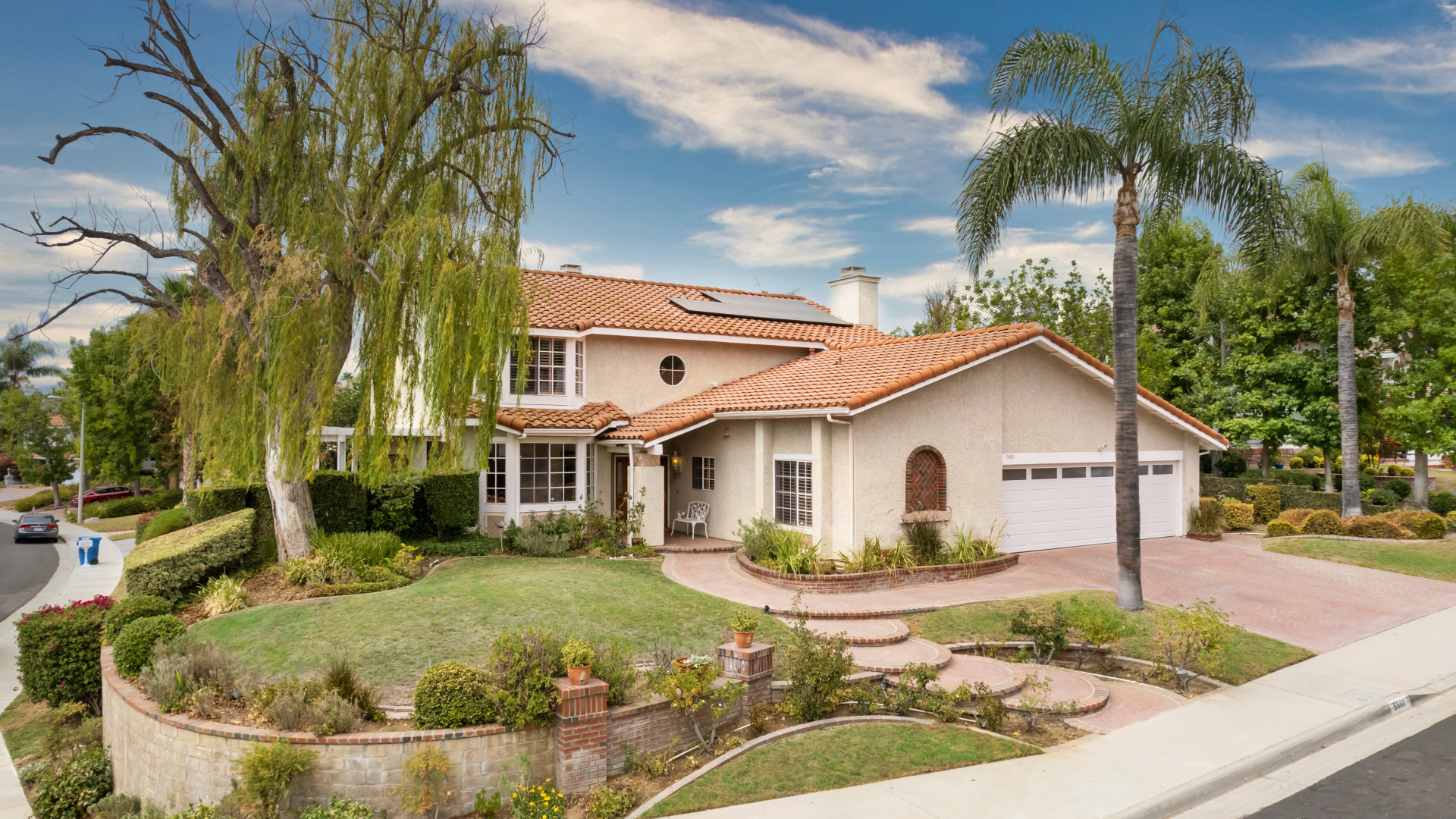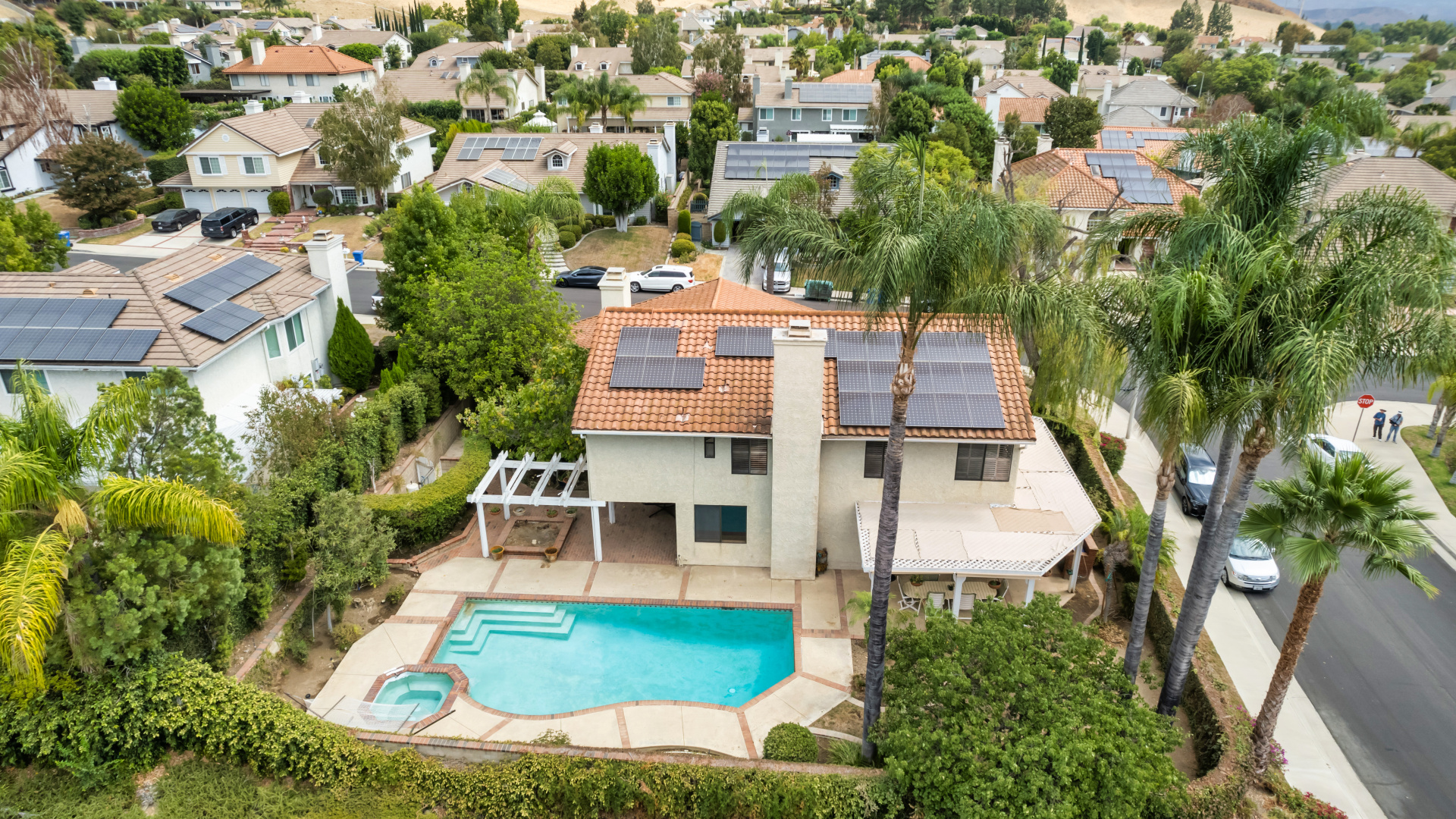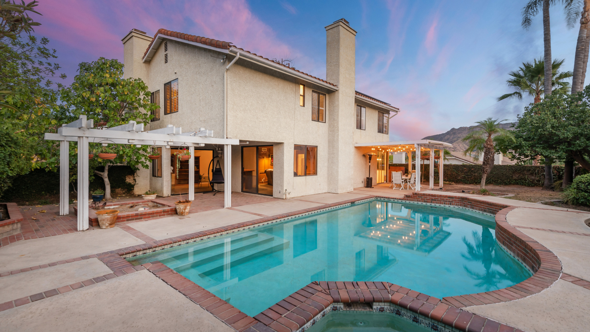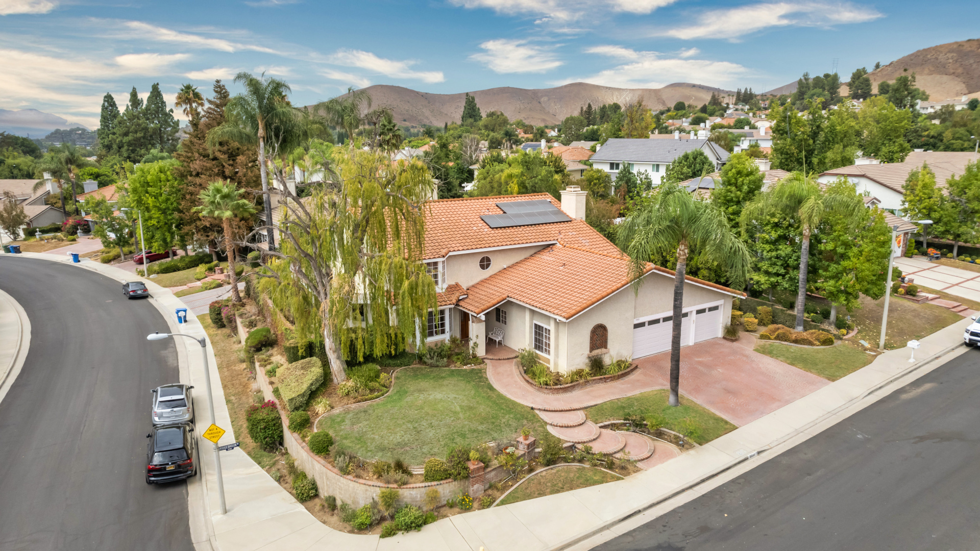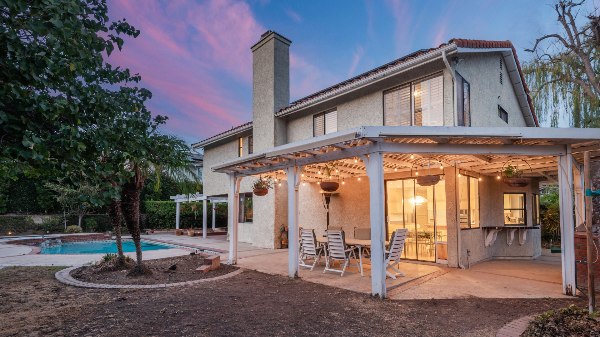Two-story traditional pool home in highly sought after South Meadows location of Morrison Ranch Estates in Agoura Hills. Built in 1985, the home features 4 bedrooms, 3 bathrooms, 3,159 SQFT of living space, and a fabulous 10,927 SQFT flat corner lot, nestled above the street for added privacy and curb appeal. With a little TLC and updating, this could be your forever dream home! Living room with newer carpeting and fireplace, plus a true formal dine. Spacious eat-in Kitchen with bay window and skylight has great bones. Wood paneled family room with crown moldings, wet bar, fireplace and sliders to the relaxing backyard. Large primary suite has an attached office or sitting room as well as a grand walk-in closet and en suite private bath with dual sinks. Dine al fresco under the pergola in the Entertainer’s back yard on the extensive patio overlooking the pool, spa, and rolling mountain views beyond. Fruit bearing trees include apricot, fig, and loquat. Other amenities include a leased Solar System, spiral staircase, central air & heat, recessed lighting, smooth ceilings, and plantation shutters. Award winning Las Virgenes School District! Close to wonderful restaurants & entertainment, great shopping, hiking trails, parks, freeways, and just a short drive to Malibu’s famous beaches. This one is a true diamond in the rough and California living at its finest!