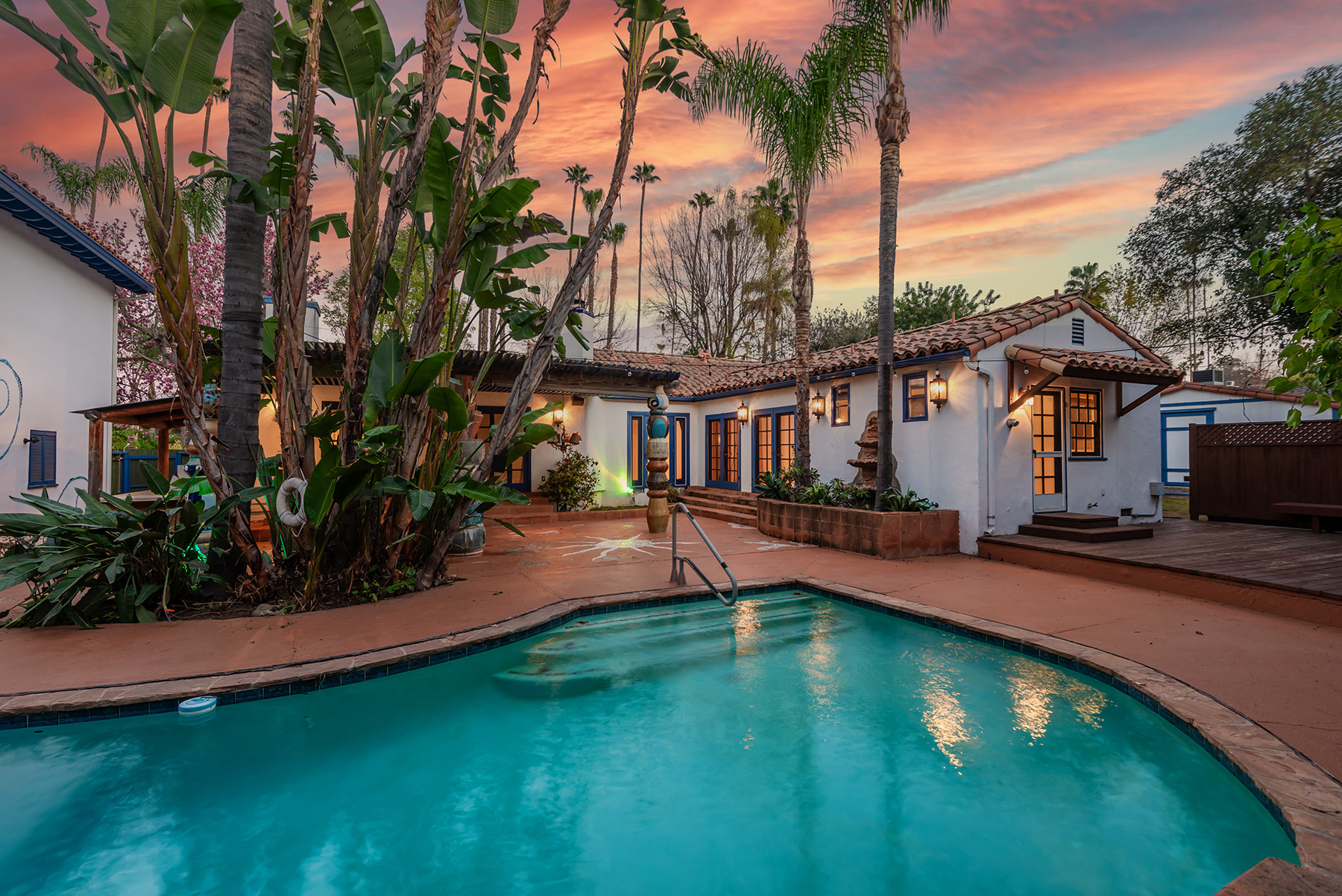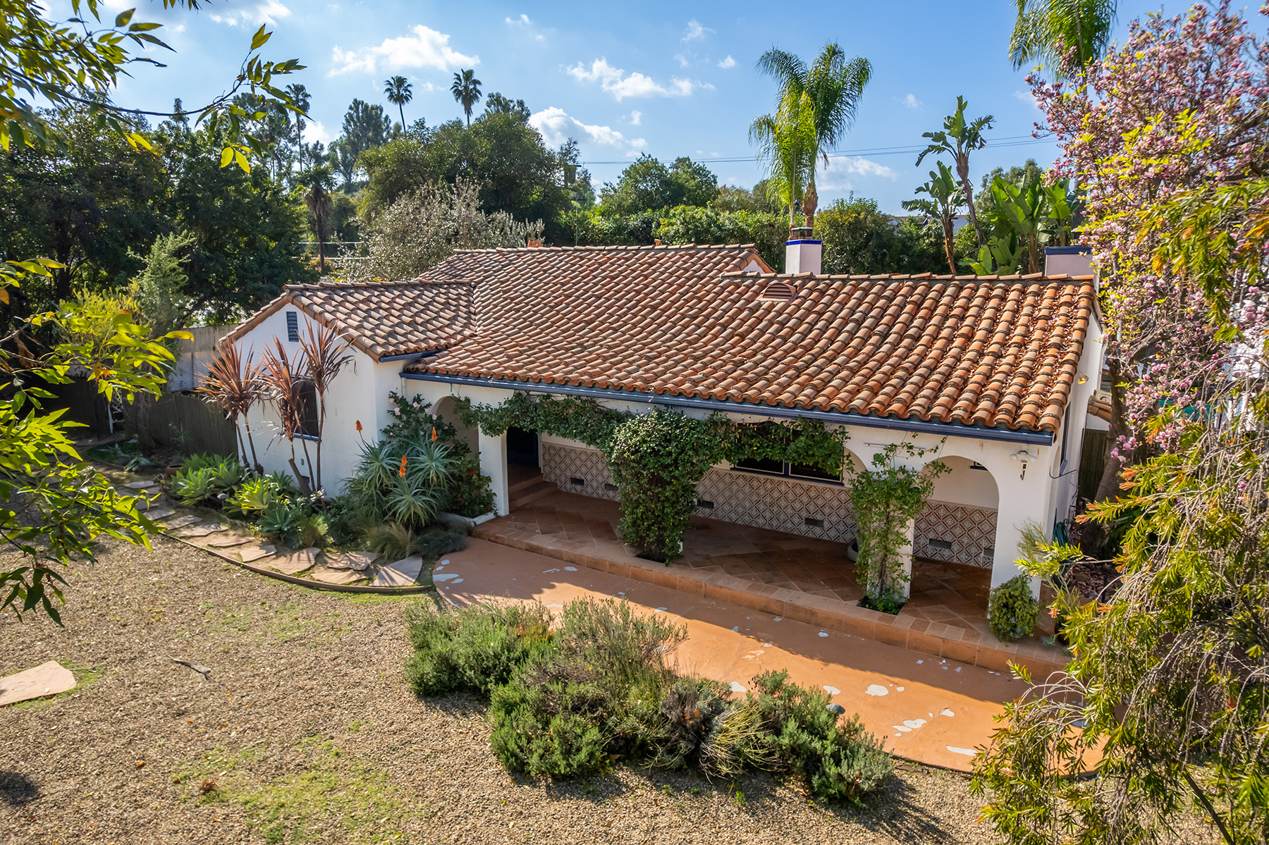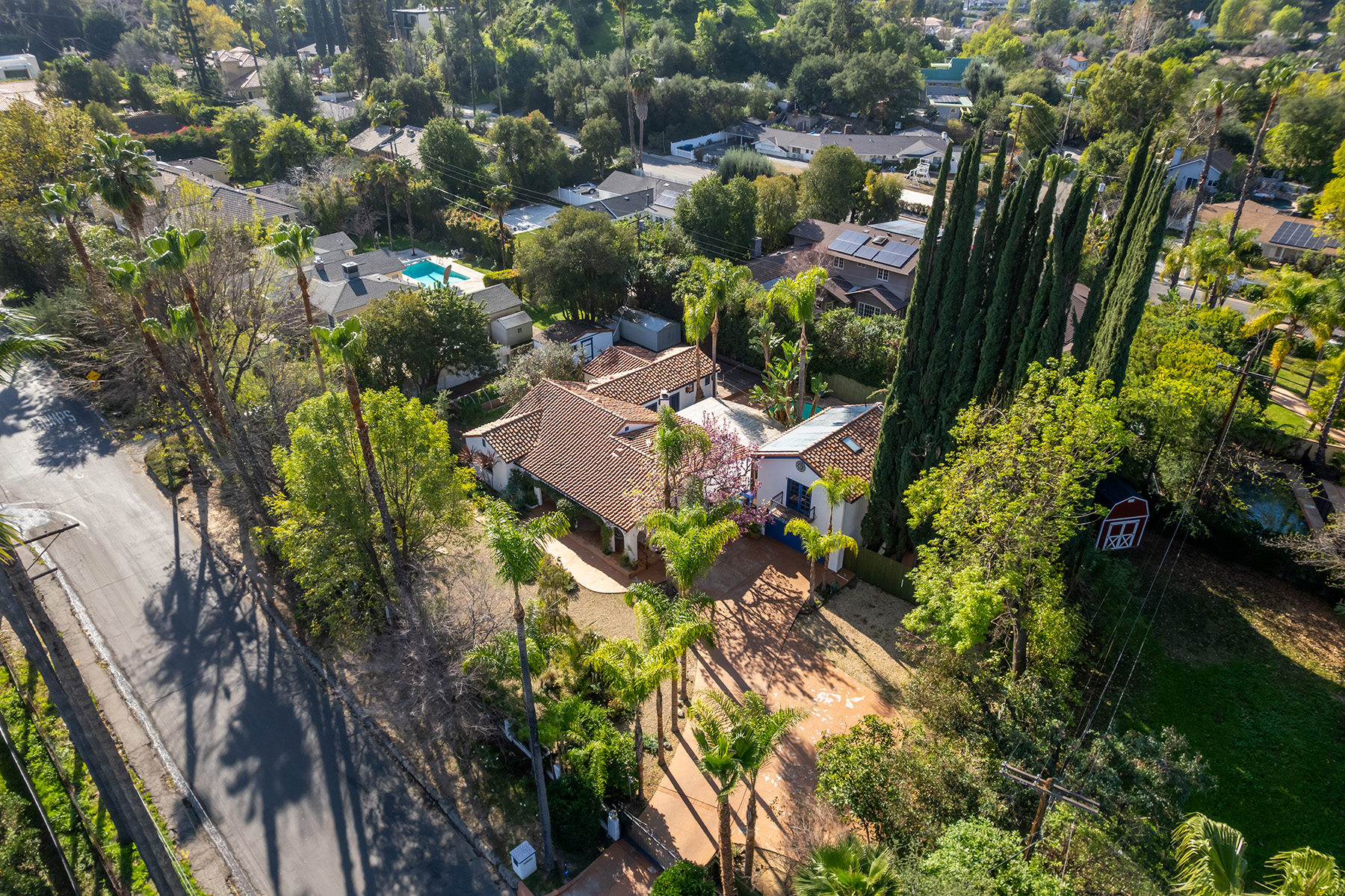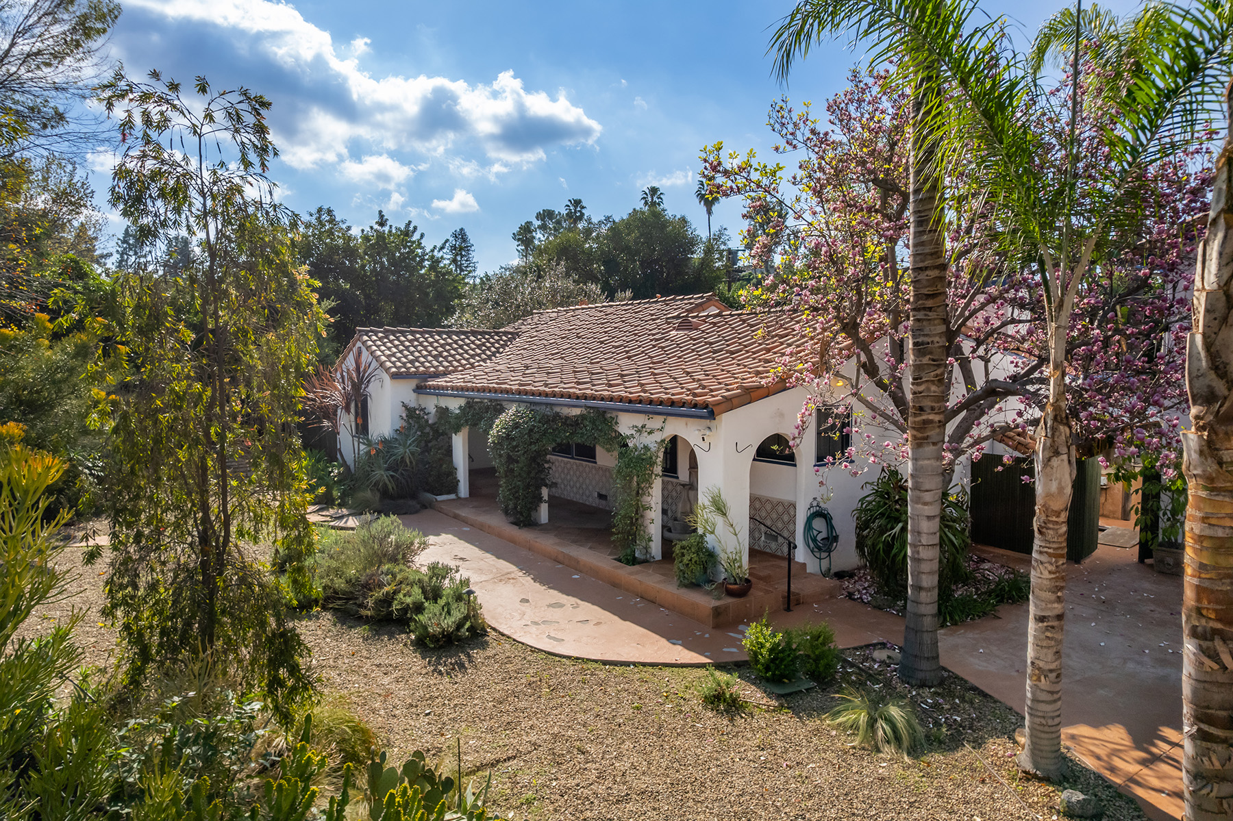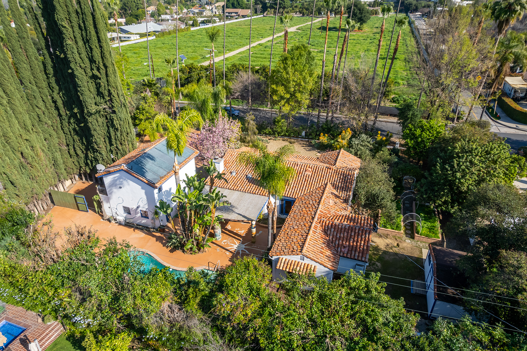 Privately gated and ideally situated south of Ventura Boulevard in Woodland Hills, this special compound presents a rare opportunity to own a single-story Spanish residence on an expansive 20,958 SQFT flat lot in one of the valley’s most sought after neighborhoods. Offering privacy, scale, and versatility, this charming home blends everyday comfort with meaningful long term potential - whether to enjoy as-is, fully renovate and expand, or build your dream estate. The interior unfolds with warmth and character, shaped by thoughtful details that give the home its unique personality. The main residence features 3 bedrooms and 2 bathrooms, hardwood flooring, smooth ceilings, recessed lighting, and is thoughtfully laid out for both entertaining and effortless daily living. A wood beamed ceiling in the family room and a chef’s kitchen with granite countertops plus large center island, anchors the heart of the home, complemented by updated bathrooms, newer interior paint, and a cozy fireplace. The spacious primary suite features a walk-in closet and a full en-suite bathroom with a spa tub and separate shower.  Abundant natural light fills the home throughout the day, creating a comfortable and welcoming environment with a seamless connection of indoor/outdoor living space. Outdoors, the resort-like grounds truly set this property apart.  Handcrafted details such as custom painted columns and mosaic wall accents quietly elevate the exterior spaces with charm and personality. The sprawling lot is highlighted by a sparkling pool, covered patio with BBQ bar, basketball court, mature gardens, planters, and multiple storage sheds - offering endless possibilities for leisure, entertaining, or future expansion. A long private electric gated driveway provides parking for multiple vehicles, adding both convenience and privacy. The estate also includes a detached two-car garage with a private upstairs recreation room and bathroom ideal for a potential ADU, home office, guest suite, or creative studio - an increasingly rare and valuable feature in today’s market. Quietly tucked away yet moments from premier dining, shopping, cafés, Topanga Village, Warner Center, local parks, and the new LA Rams practice facility, with easy access to freeways and the beach via canyon roads, this is a truly distinctive offering.