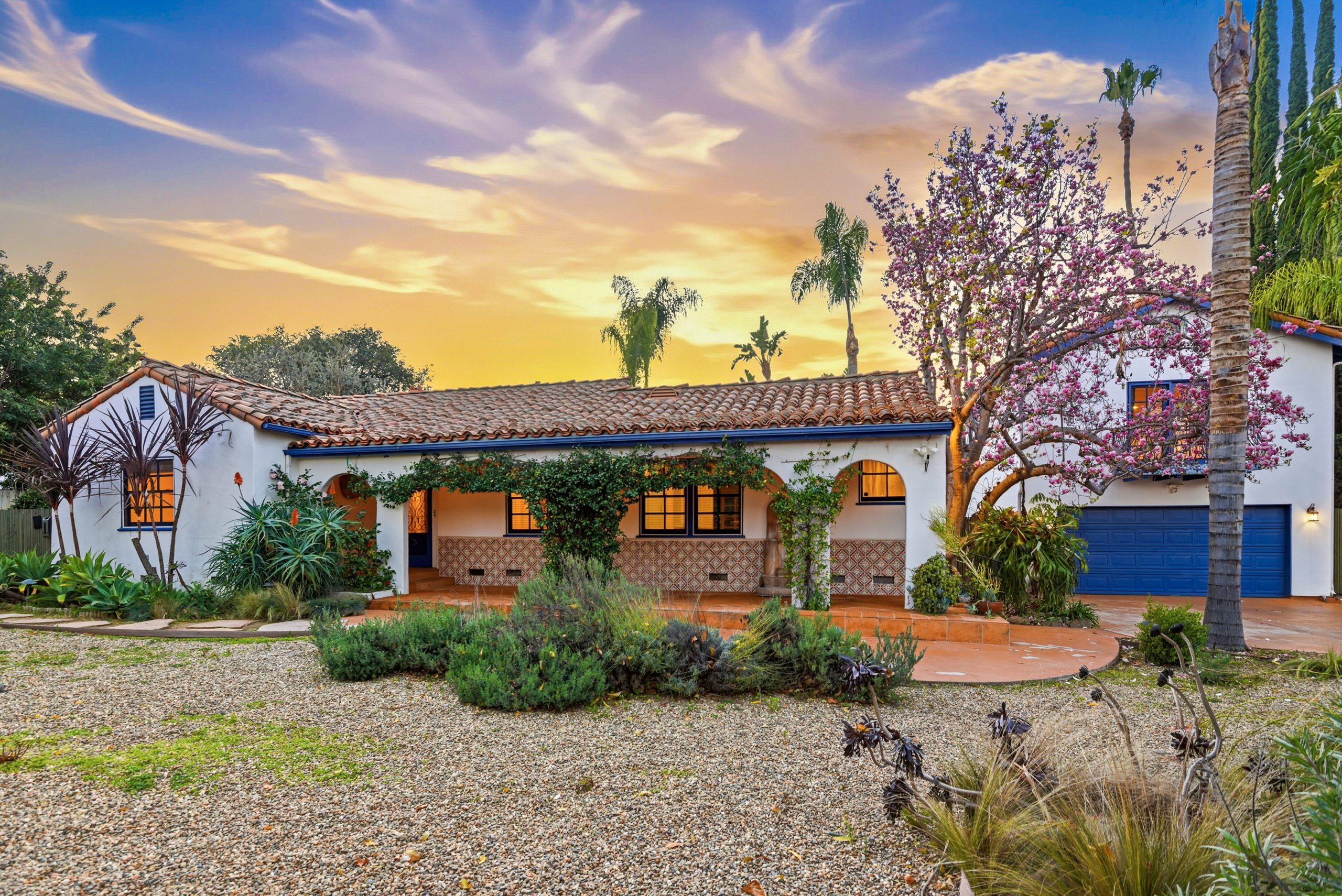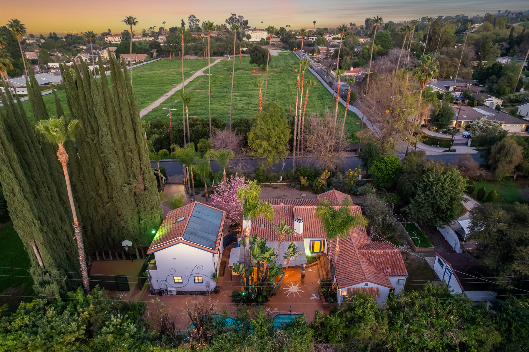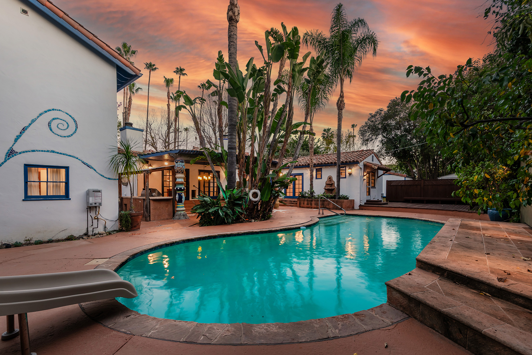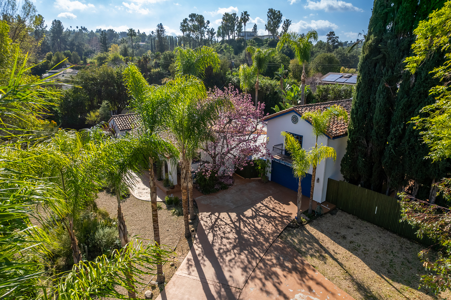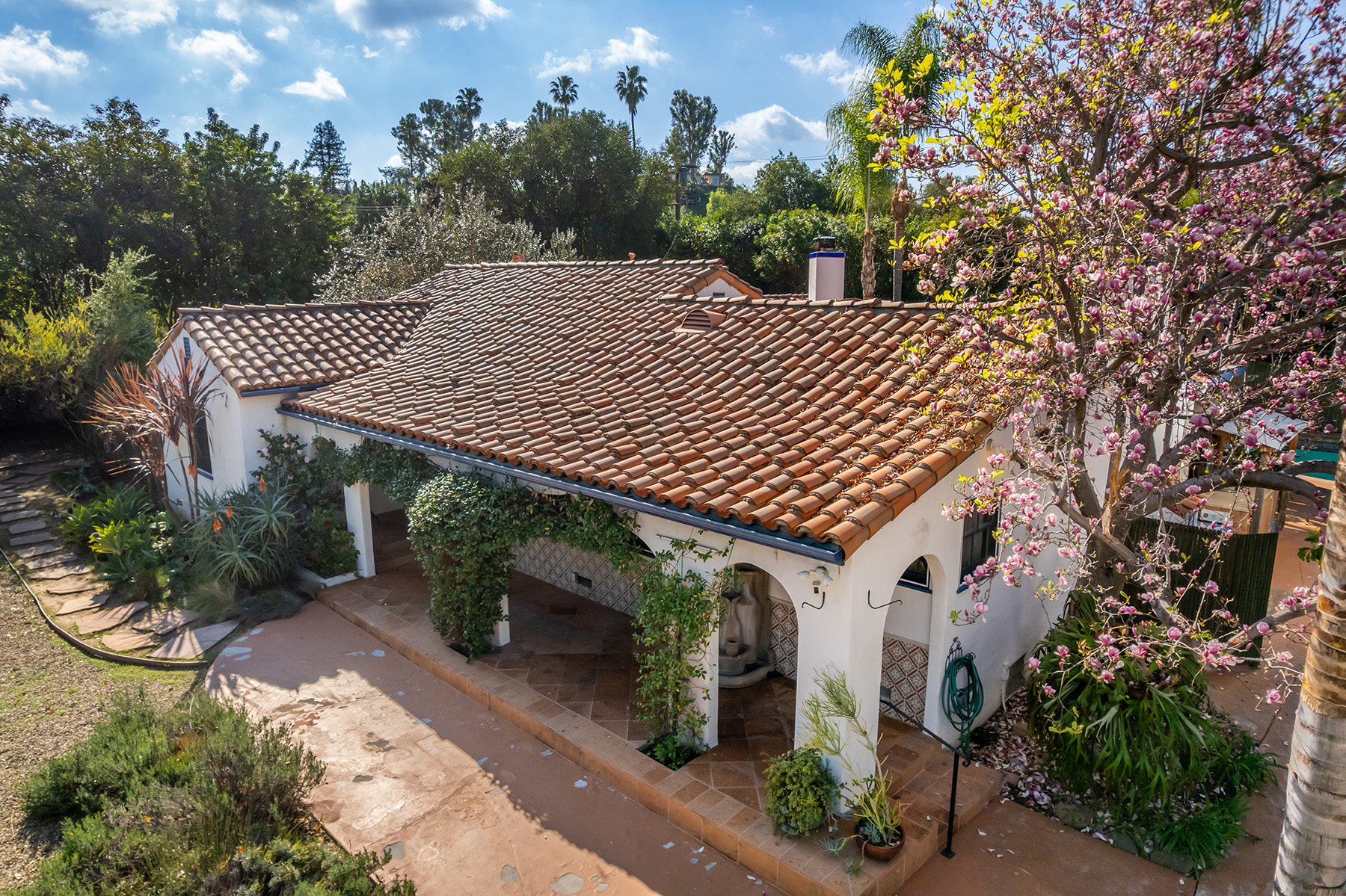 Privately gated and ideally situated south of Ventura Boulevard in Woodland Hills, this special compound presents a rare opportunity to own a single-story Spanish residence on an expansive 20,958 SQFT flat lot in one of the valley’s most sought after neighborhoods. Offering privacy, scale, and versatility, this charming home blends everyday comfort with meaningful long term potential - whether to enjoy as-is, fully renovate and expand, or build your dream estate. The interior unfolds with warmth and character, shaped by thoughtful details that give the home its unique personality. The main residence features 3 bedrooms and 2 bathrooms, hardwood flooring, smooth ceilings, recessed lighting, and is thoughtfully laid out for both entertaining and effortless daily living. A wood beamed ceiling in the family room and a chef’s kitchen with granite countertops plus large center island, anchors the heart of the home, complemented by updated bathrooms, newer interior paint, and a cozy fireplace. The spacious primary suite features a walk-in closet and a full en-suite bathroom with a spa tub and separate shower.  Abundant natural light fills the home throughout the day, creating a comfortable and welcoming environment with a seamless connection of indoor/outdoor living space. Outdoors, the resort-like grounds truly set this property apart.  Handcrafted details such as custom painted columns and mosaic wall accents quietly elevate the exterior spaces with charm and personality. The sprawling lot is highlighted by a sparkling pool, covered patio with BBQ bar, basketball court, mature gardens, planters, and multiple storage sheds - offering endless possibilities for leisure, entertaining, or future expansion. A long private electric gated driveway provides parking for multiple vehicles, adding both convenience and privacy. The estate also includes a detached two-car garage with a private upstairs recreation room and bathroom ideal for a potential ADU, home office, guest suite, or creative studio - an increasingly rare and valuable feature in today’s market. Quietly tucked away yet moments from premier dining, shopping, cafés, Topanga Village, Warner Center, local parks, and the new LA Rams practice facility, with easy access to freeways and the beach via canyon roads, this is a truly distinctive offering.