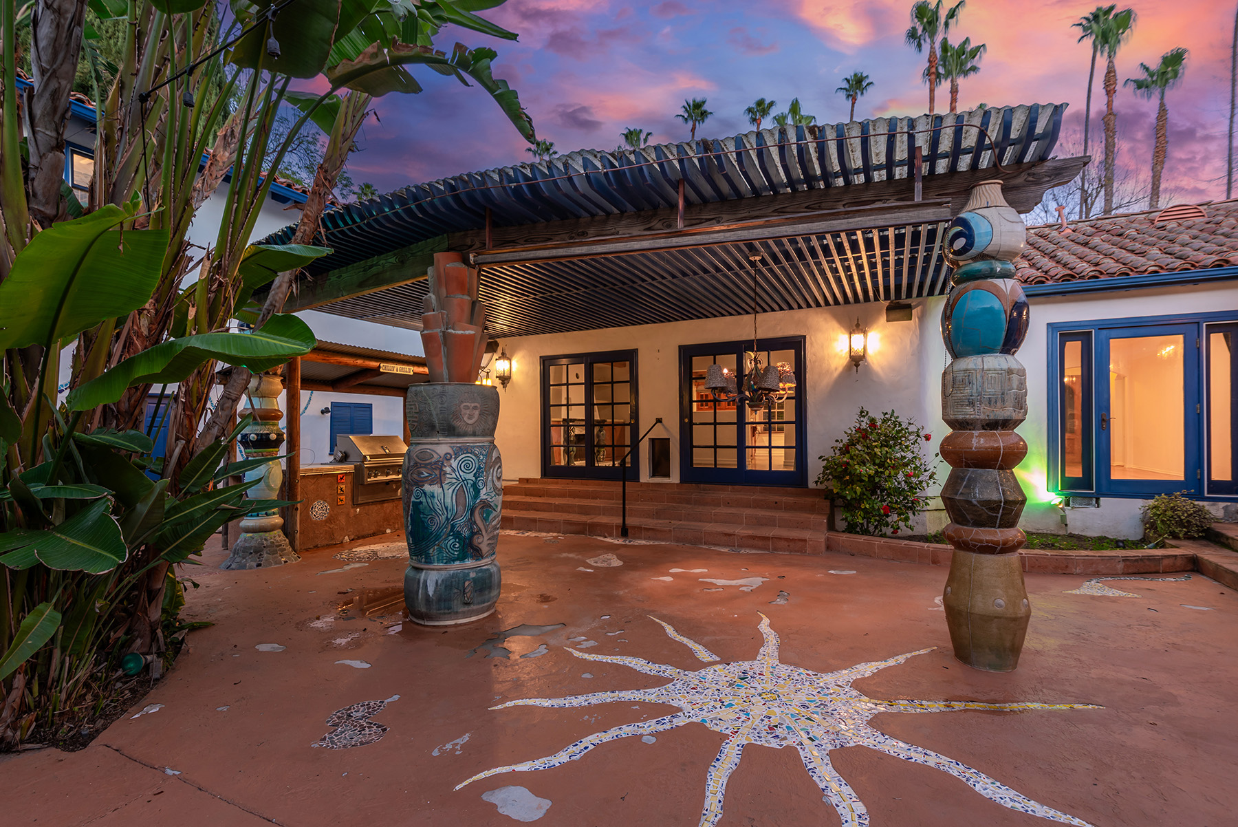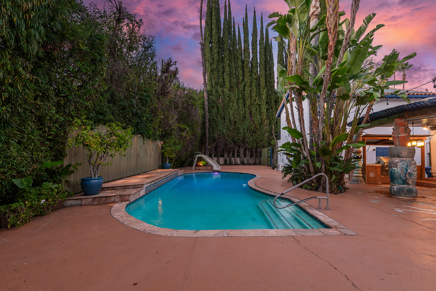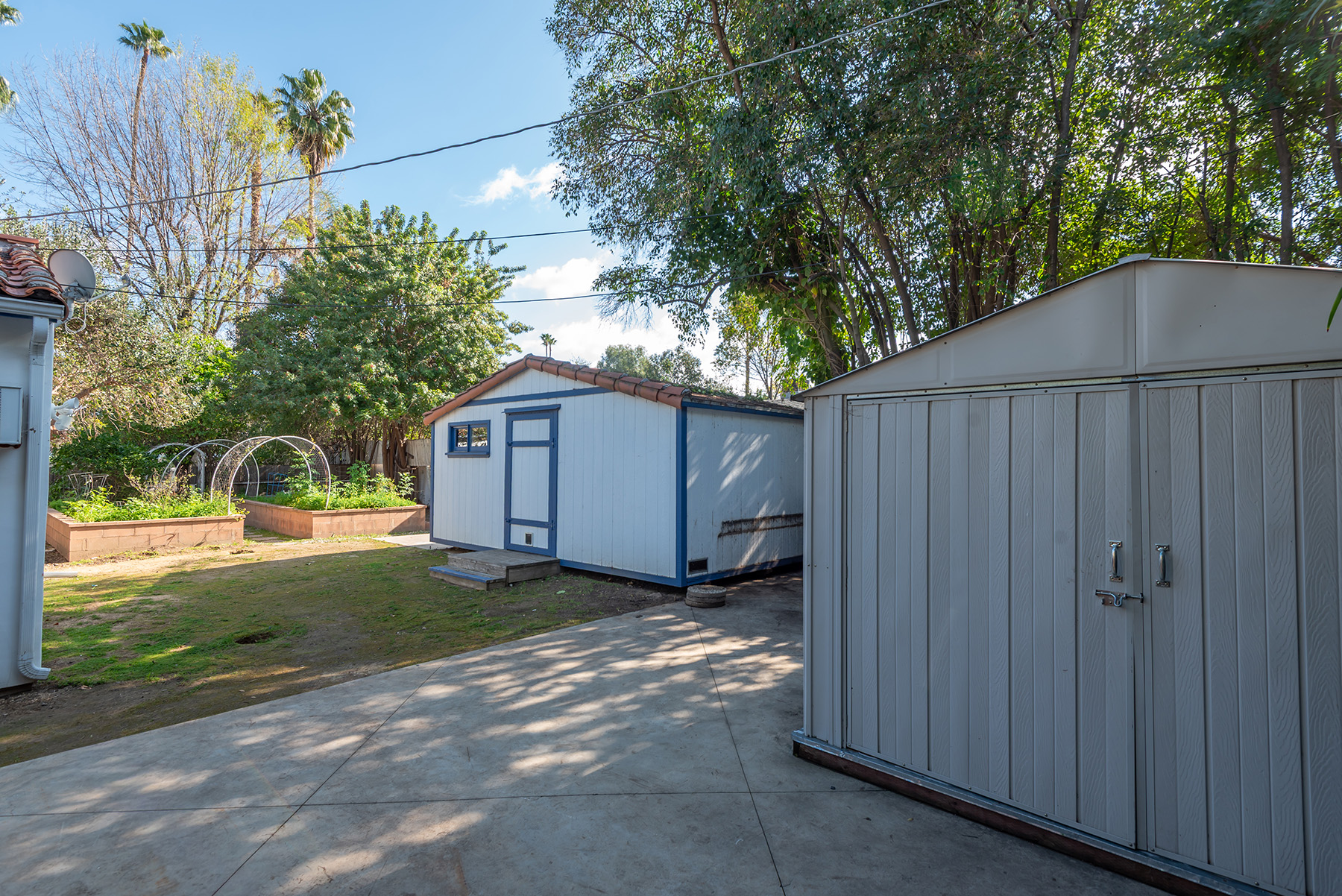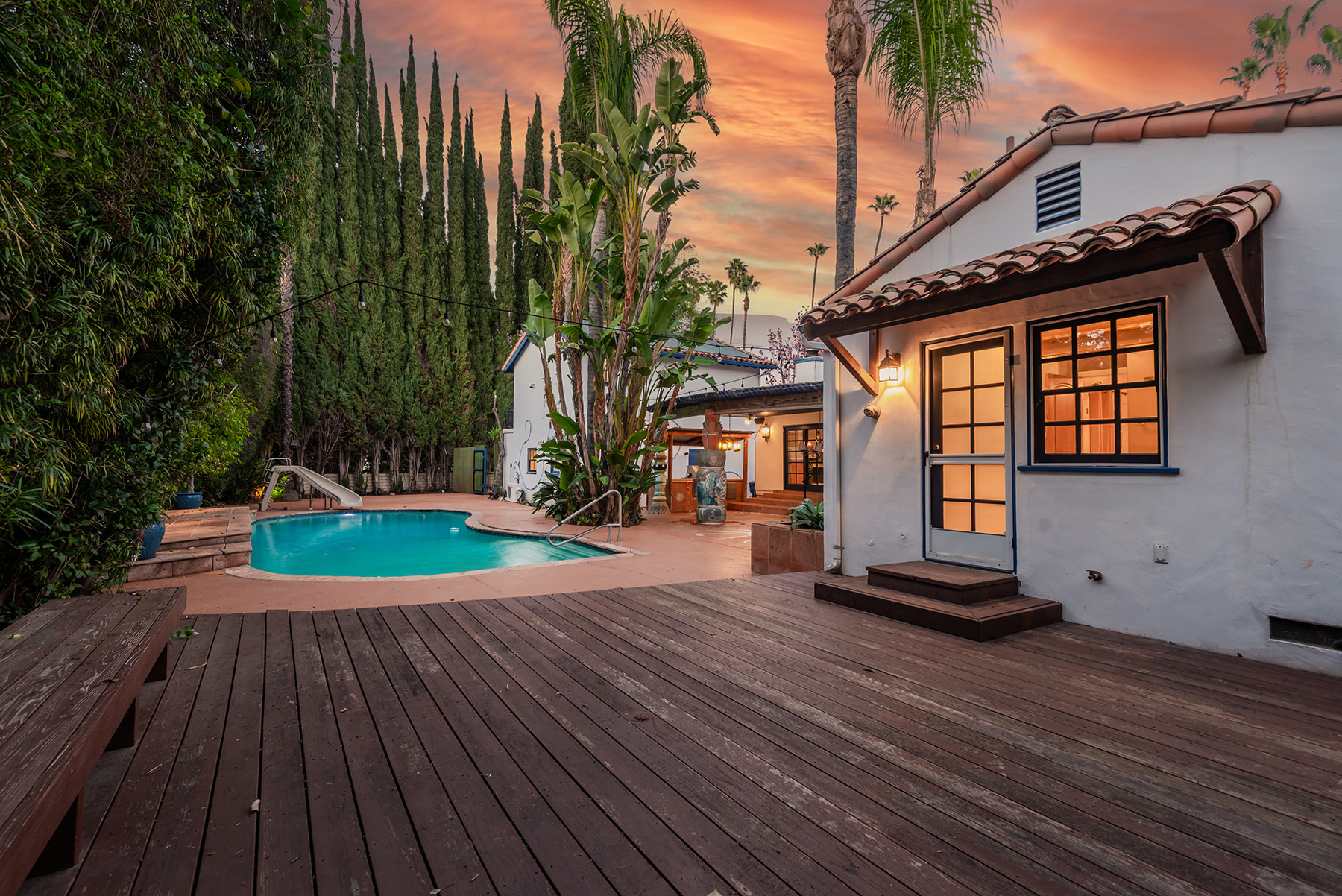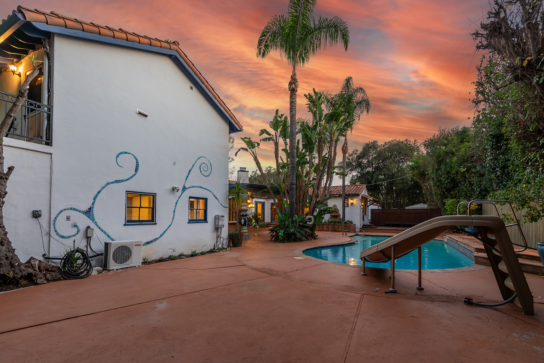 Privately gated and ideally situated south of Ventura Boulevard in Woodland Hills, this special compound presents a rare opportunity to own a single-story Spanish residence on an expansive 20,958 SQFT flat lot in one of the valley’s most sought after neighborhoods. Offering privacy, scale, and versatility, this charming home blends everyday comfort with meaningful long term potential - whether to enjoy as-is, fully renovate and expand, or build your dream estate. The interior unfolds with warmth and character, shaped by thoughtful details that give the home its unique personality. The main residence features 3 bedrooms and 2 bathrooms, hardwood flooring, smooth ceilings, recessed lighting, and is thoughtfully laid out for both entertaining and effortless daily living. A wood beamed ceiling in the family room and a chef’s kitchen with granite countertops plus large center island, anchors the heart of the home, complemented by updated bathrooms, newer interior paint, and a cozy fireplace. The spacious primary suite features a walk-in closet and a full en-suite bathroom with a spa tub and separate shower.  Abundant natural light fills the home throughout the day, creating a comfortable and welcoming environment with a seamless connection of indoor/outdoor living space. Outdoors, the resort-like grounds truly set this property apart.  Handcrafted details such as custom painted columns and mosaic wall accents quietly elevate the exterior spaces with charm and personality. The sprawling lot is highlighted by a sparkling pool, covered patio with BBQ bar, basketball court, mature gardens, planters, and multiple storage sheds - offering endless possibilities for leisure, entertaining, or future expansion. A long private electric gated driveway provides parking for multiple vehicles, adding both convenience and privacy. The estate also includes a detached two-car garage with a private upstairs recreation room and bathroom ideal for a potential ADU, home office, guest suite, or creative studio - an increasingly rare and valuable feature in today’s market. Quietly tucked away yet moments from premier dining, shopping, cafés, Topanga Village, Warner Center, local parks, and the new LA Rams practice facility, with easy access to freeways and the beach via canyon roads, this is a truly distinctive offering.