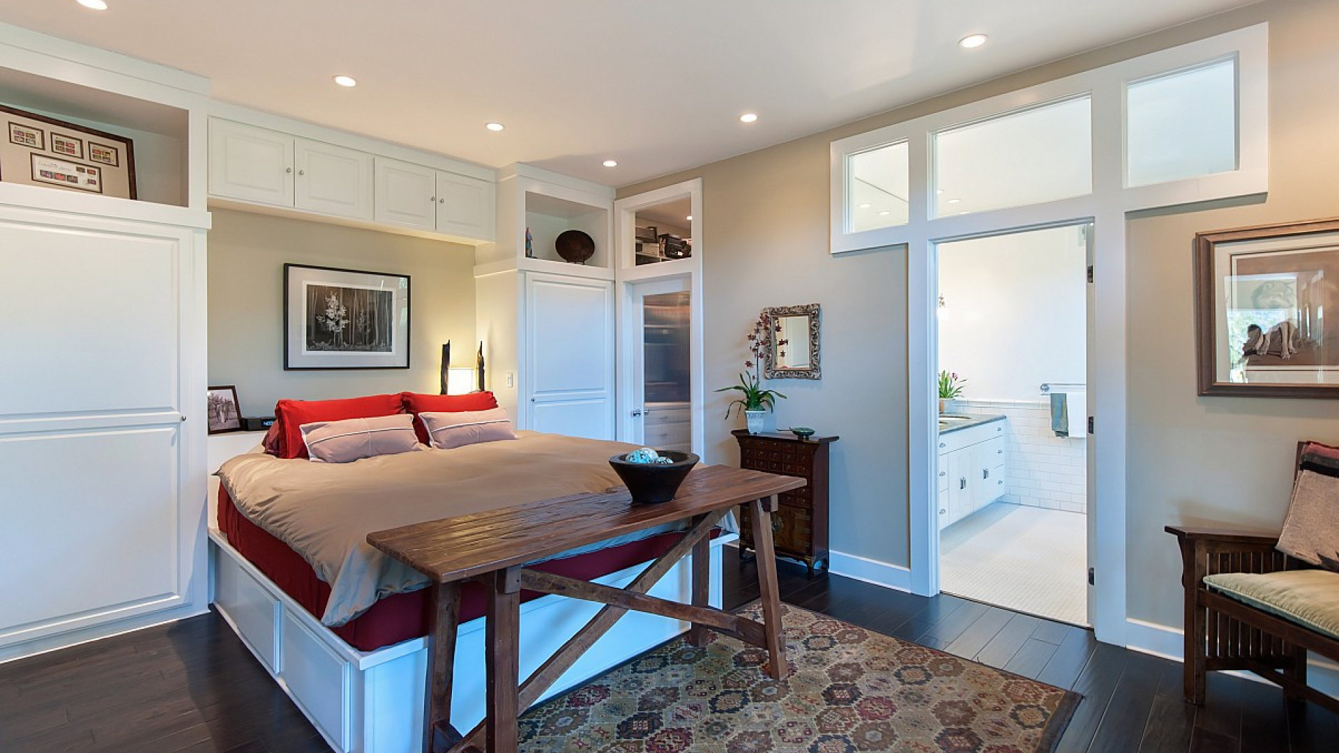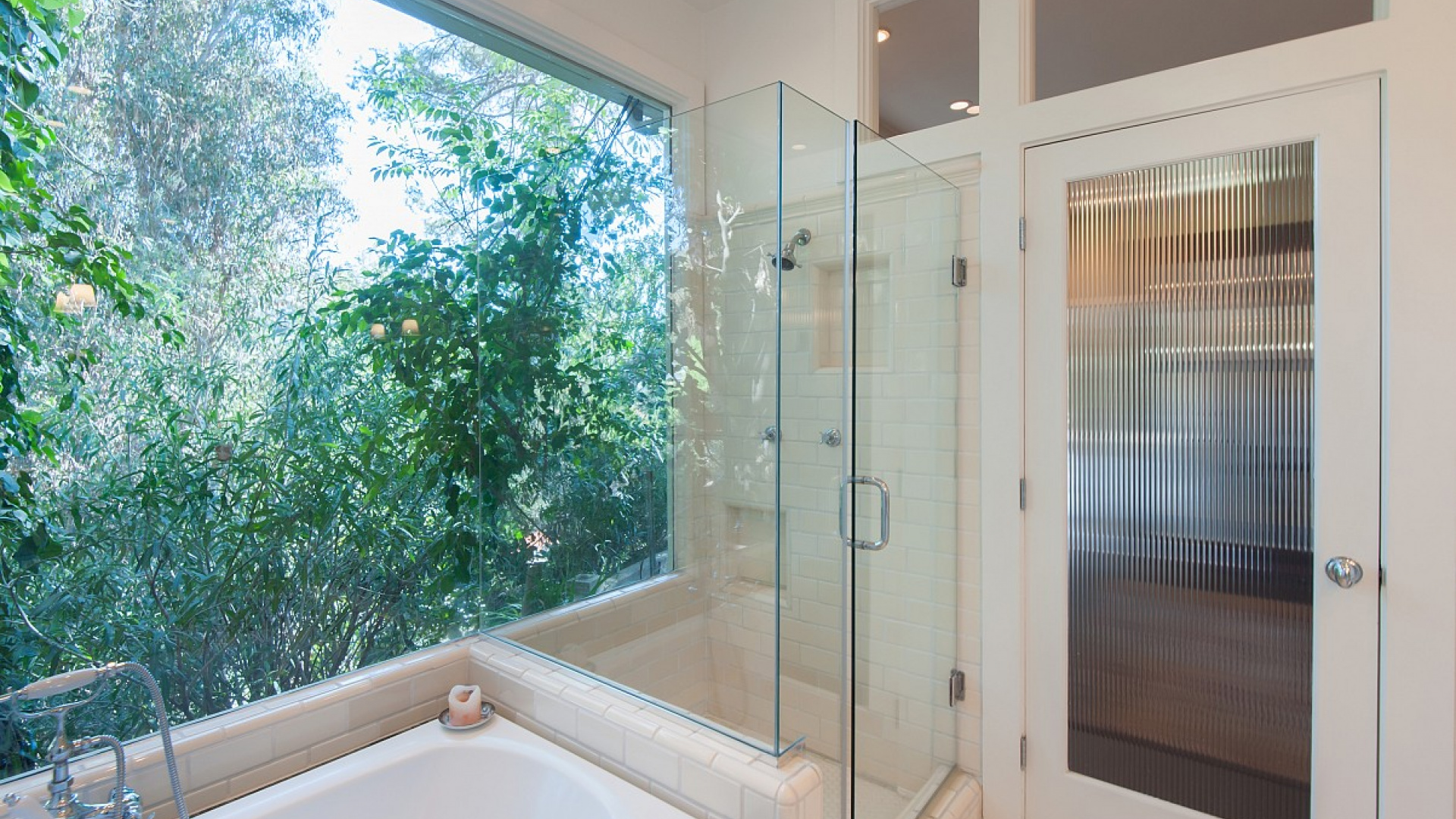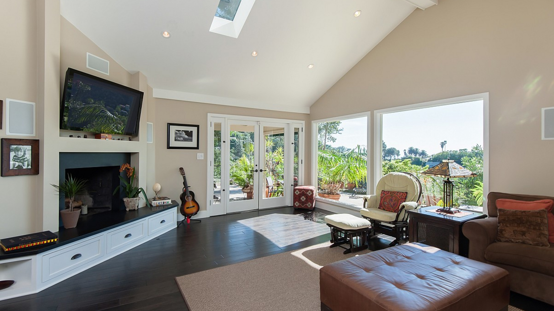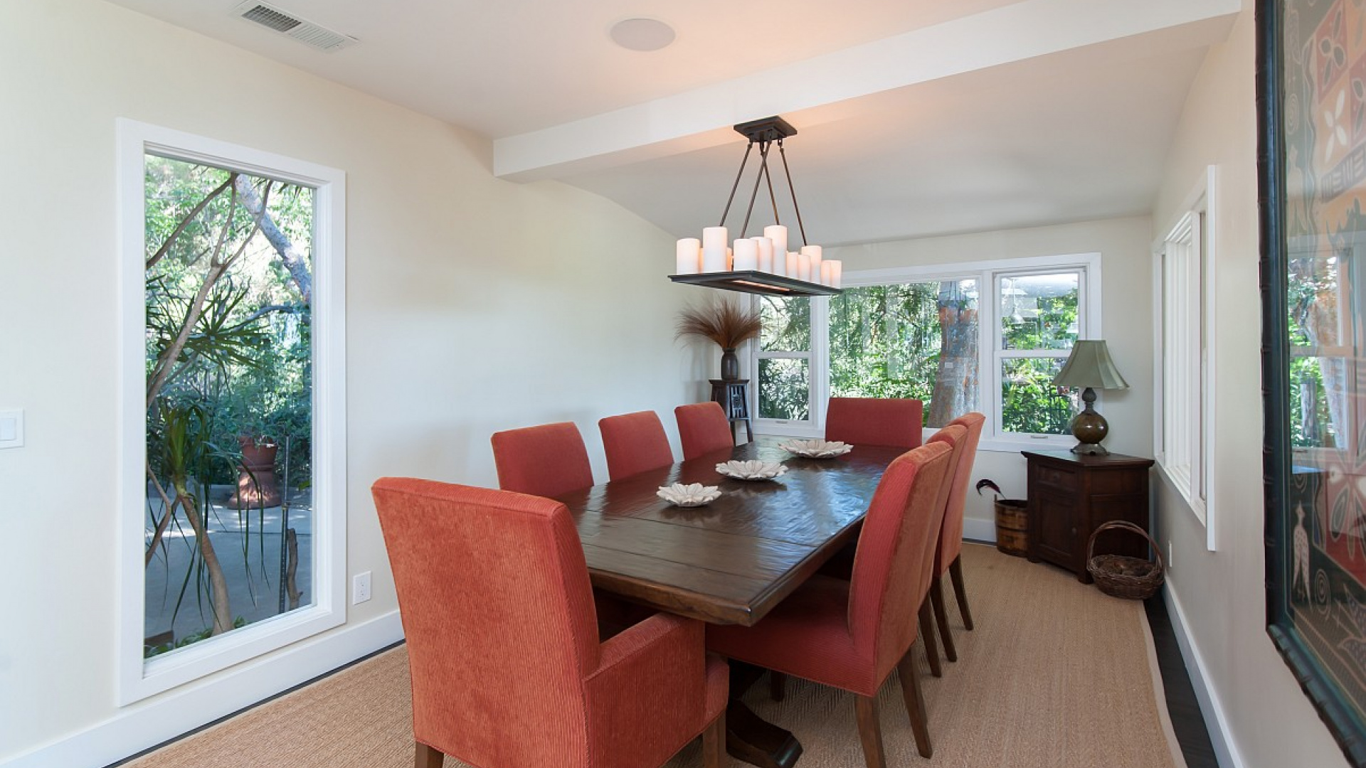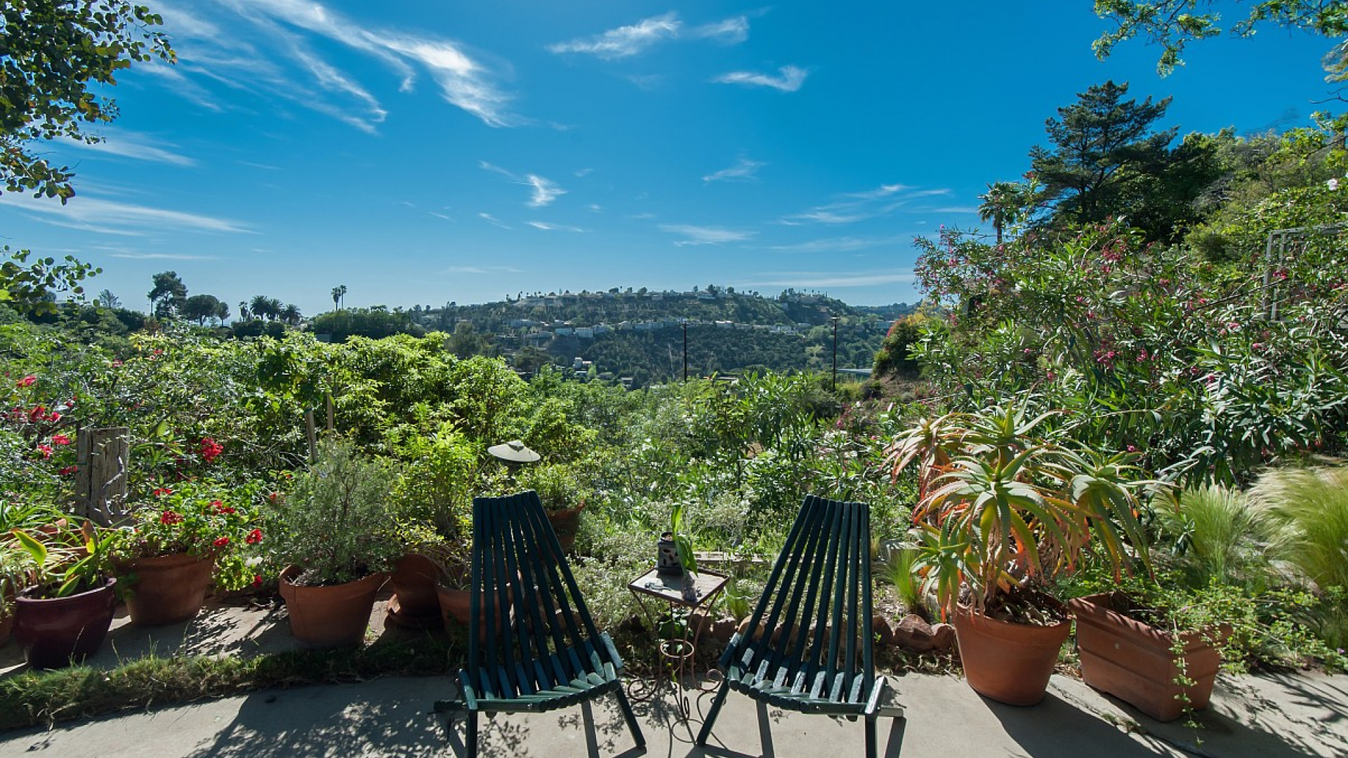 Travel down a long driveway into a peaceful, private setting. This lovely remodeled home is nestled among lush mature trees, beautiful succulents and other flowering drought tolerant foliage. Inviting front porch leads you to the spacious living room, boasting of expansive windows overlooking the breathtaking canyon views, expanding all the way to the ocean on a clear day. Its voluminous ceiling has sky lights, recessed lights, a fireplace with honed black marble face and hearth. Built in drawers under the hearth seat for added storage. French doors lead to the covered patios. Dark walnut floors throughout the living room and the rest of the home. Quality dual paned windows encased in white framing throughout the home. Completely remodeled kitchen boasts; Stainless Thermador range, Viking range hood, GE Monogram built-in double door frig, dishwasher and built-in wine/beverage frig. Quartz counters in a beautiful Sage color, glass tile backsplash, sea grass color Limestone flooring, porcelain Farm style double bowl sinks, glass faced upper cabinets, soft closing drawers and under cabinet lighting. The breakfast bar is a popular gathering place. Formal dining Room includes a lovely light fixture. 2 en suite bedrooms. The first bathroom has Kohler toilet and pedestal sink, Walker Zanger tiled shower and walls, oversized Rainwater showerhead, 2 side body sprays, built in niche inside shower and built in towel shelves. The Master suite includes sliding French doors leading to a private patio enclosed by lush vegetation. A built-in bed stand, built in closets and a walk in closet with custom organized features. The master bath has double sinks, lovely granite counters, quality fixtures, a spa tub, separate shower and walls of windows exuding an indoor/outdoor feeling. Laundry room has ample custom cabinetry and Quartz counters. A Dutch door leads to the front patio and to the studio. The studio is currently used as a guest room. It has a ½ bath and loads of storage space. Central heating and air are included in this space. This room is a perfect space for a sound studio, yoga/pilates studio, artists retreat, guest unit, and etcetera. Other features include: surround sound in living room, kitchen, formal dining room and outside patio area, security system, new electric panel and plugs and switches, copper plumbing, brand new 50 gallon water heater. Beautiful light fixtures throughout the home. Two patio areas, retractable awnings at south side of the home. Herb garden is located outside the kitchen, a lemon and a pomegranate tree, and a stepping stone path that leads to a secluded bench in the trees overlooking the lovely views. Nichols Canyon area of the Hollywood Hills is a most desirable location. This home is on one of the preferred streets and is a short walk to popular Runyon Canyon Park. Drive 10 minutes to Downtown Hollywood and 10 minutes to Universal City.